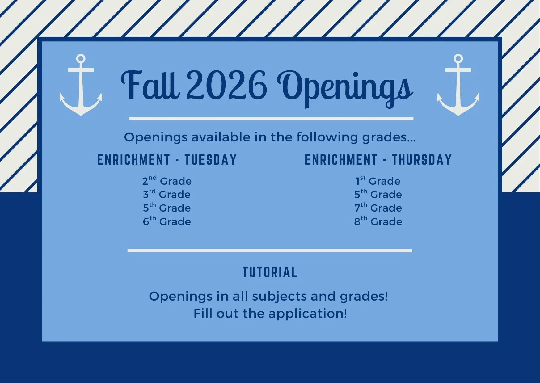 Anchored Homeschool LLC “We have this hope as an anchor for the soul, firm and secure.”~Hebrews 16:9 Information for 2026-2027 School Year Did you miss the Interest Meeting?Click here to see the slideshow we went over! Registration is open! Tuesday Enrichment Registration - Click hereThursday Enrichment Registration - Click hereTutorial Application - Click here